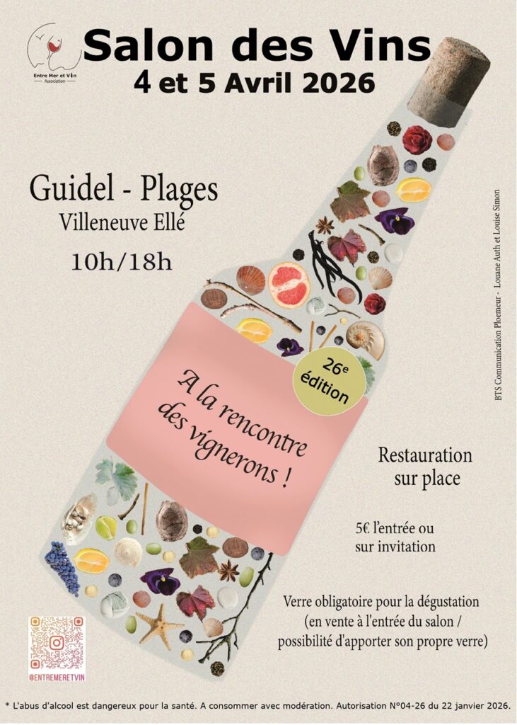 4 & 5 avril 2026 La Villeneuve-Ellé - Guidel Amateurs, fins connaisseurs ou curieux, soyez les bienvenus à la rencontre des vignerons... Venir au salon Retrouvez les informations pratiques pour venir au salon Infos pratiques GNU Free Documentation License Les vignerons Découvrez la liste des exposants de l’édition 2026 Les exposants Notre association Faites connaissance avec Entre Mer et Vin, l’association qui organise le salon Qui sommes-nous? “Le vin, c’est de la géographie liquide. » Eric Orsenna Contact Facebook Instagram Le programme du salon en PDF